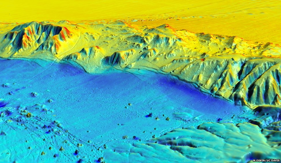 An international team of scientists has released a laser-radar image of the area surrounding the site of a Magnitude 7.2 earthquake that occurred in Mexicali, Mexico, in 2010. The technique can spot surface changes of just a few centimetres; here blue represents a post-quake reduction in height and red indicates an increase.